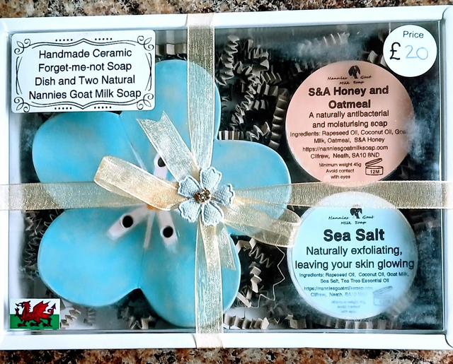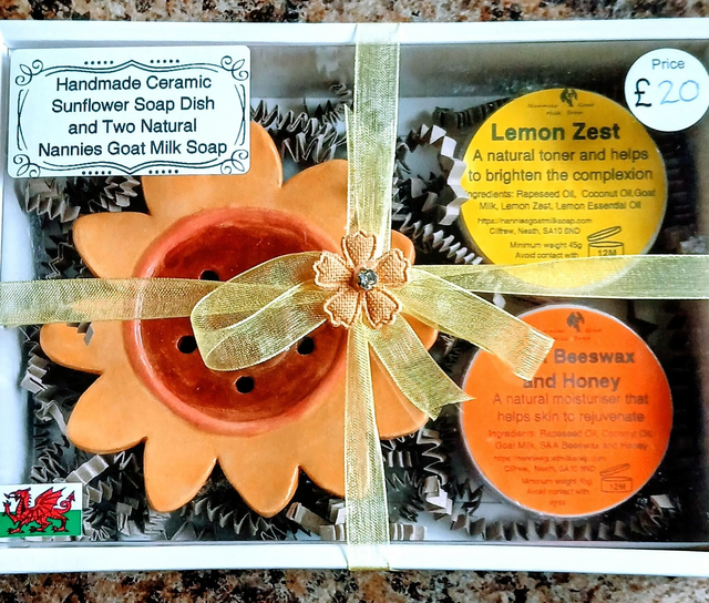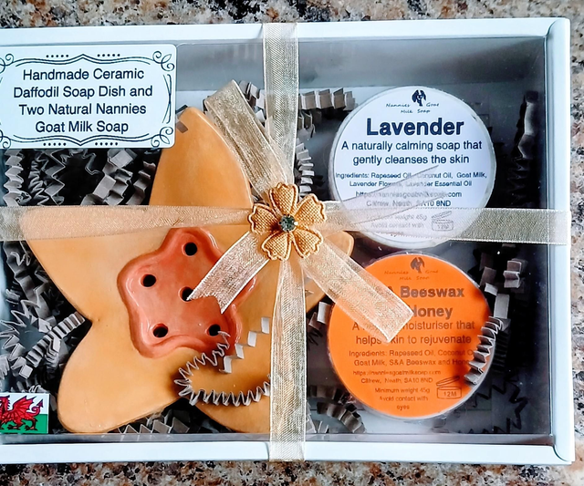 Each set includes a handcrafted ceramic soap dish paired with two luxurious 45g round goat milk soaps, presented in a charming gift box.