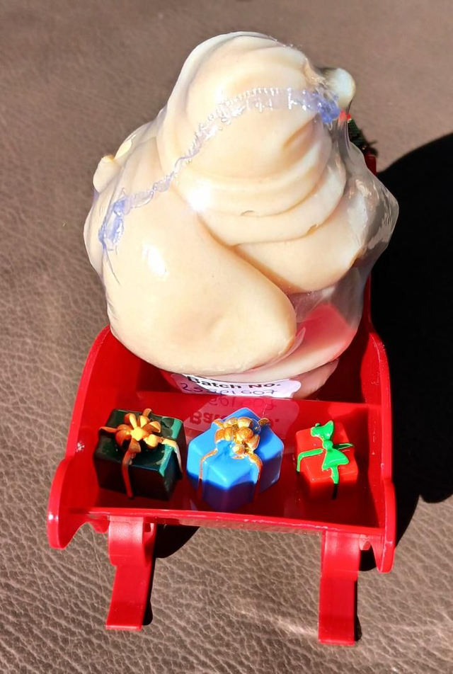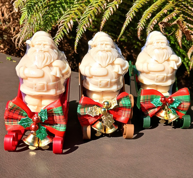 Celebrate the season with this charming natural goat milk Santa soap, handcrafted with care and perfect for gifting. Each Santa comes seated in his own mini sleigh, beautifully decorated with a festive bow and golden bells, and carrying tiny gifts ready to deliver! ๐